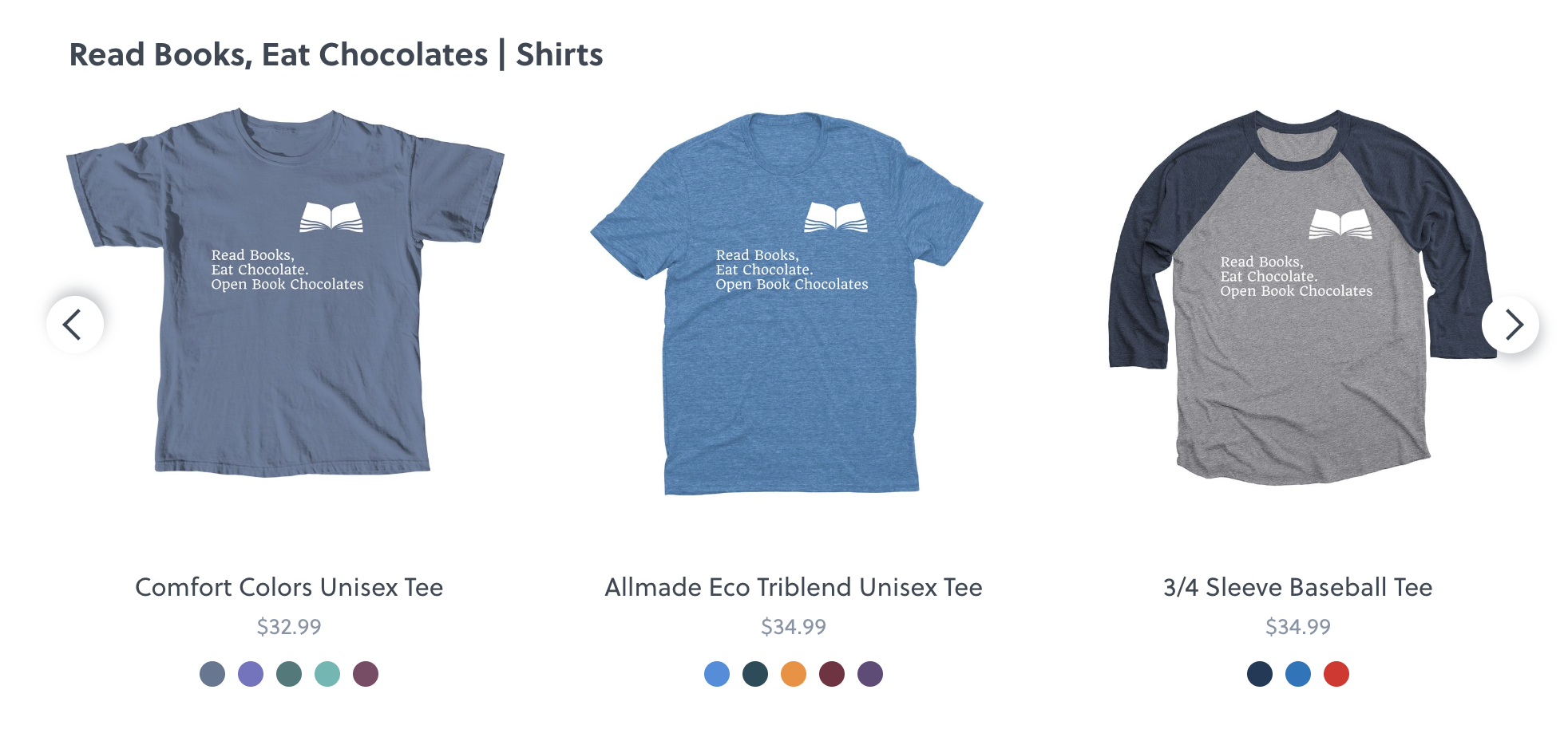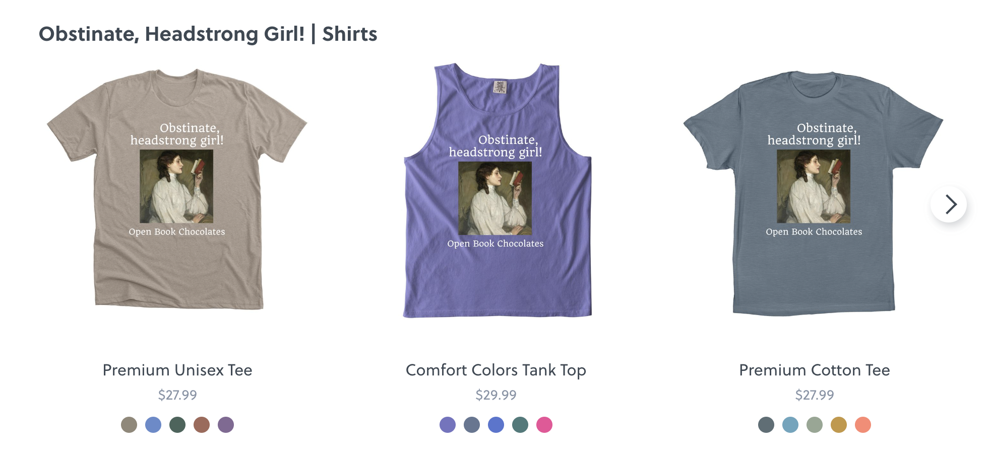 Through Bonfire, I’ve designed some shirts and mugs with our “Read Books, Eat Chocolate” slogan. I’ve also designed some shirts with the fantastic Jane Austen quote, “obstinate, headstrong girl!”